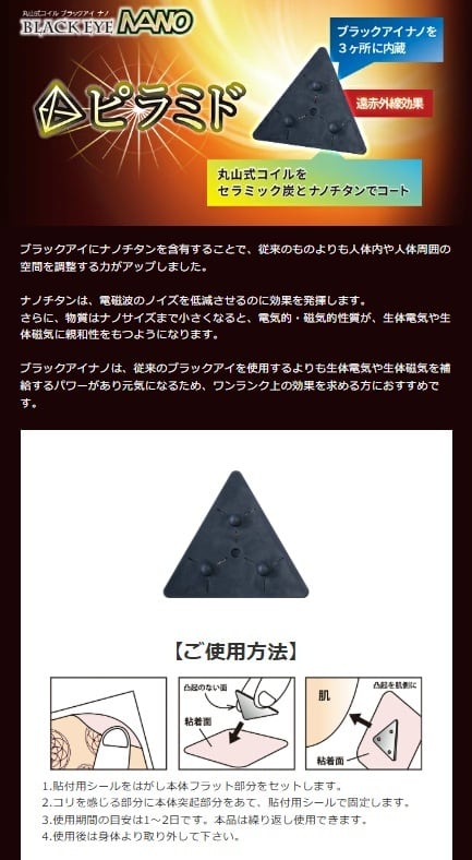 ブラックアイにナノチタンを含有することで従来のものよりもパワーアップし、更にピラミッド型に3個配置することで強力な効果を実現しました。