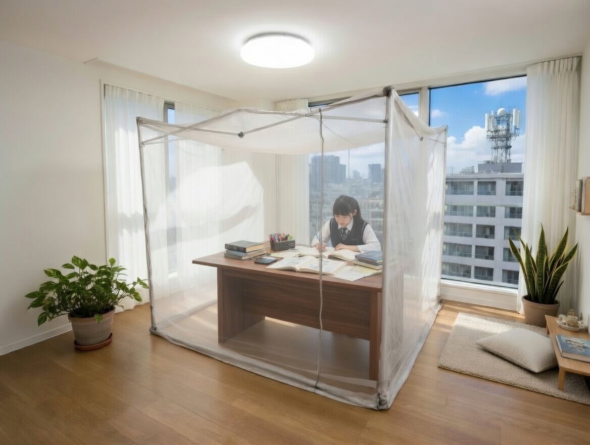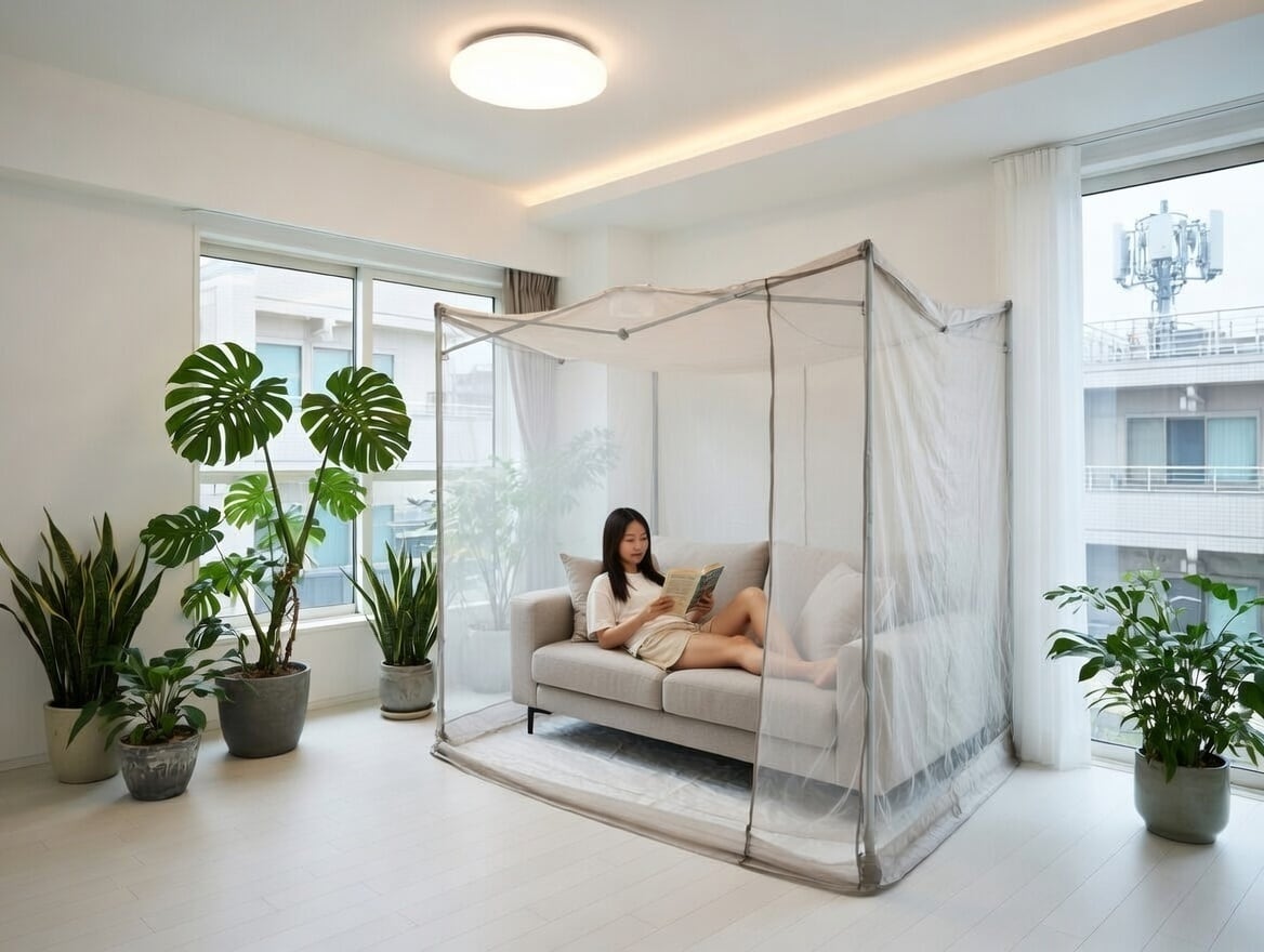 このように有害な人工電磁波により、身体的、精神的苦痛を訴える方よりかねてから要望がありました蚊帳シェルターをご用意いたしました。