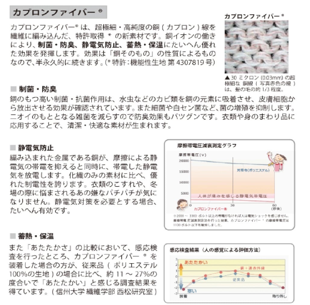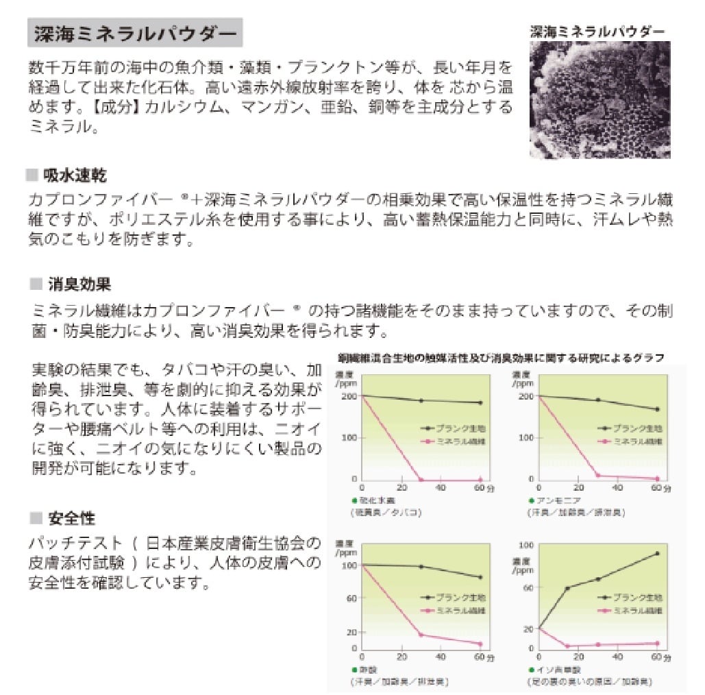 素材 ナイロン、ポリエステル、ポリウレタン、鉄、金属繊維、多層丸山式コイル、フラーレンセラミック(フラーレンC60、カーボンナノチューブ、酸化鉄)