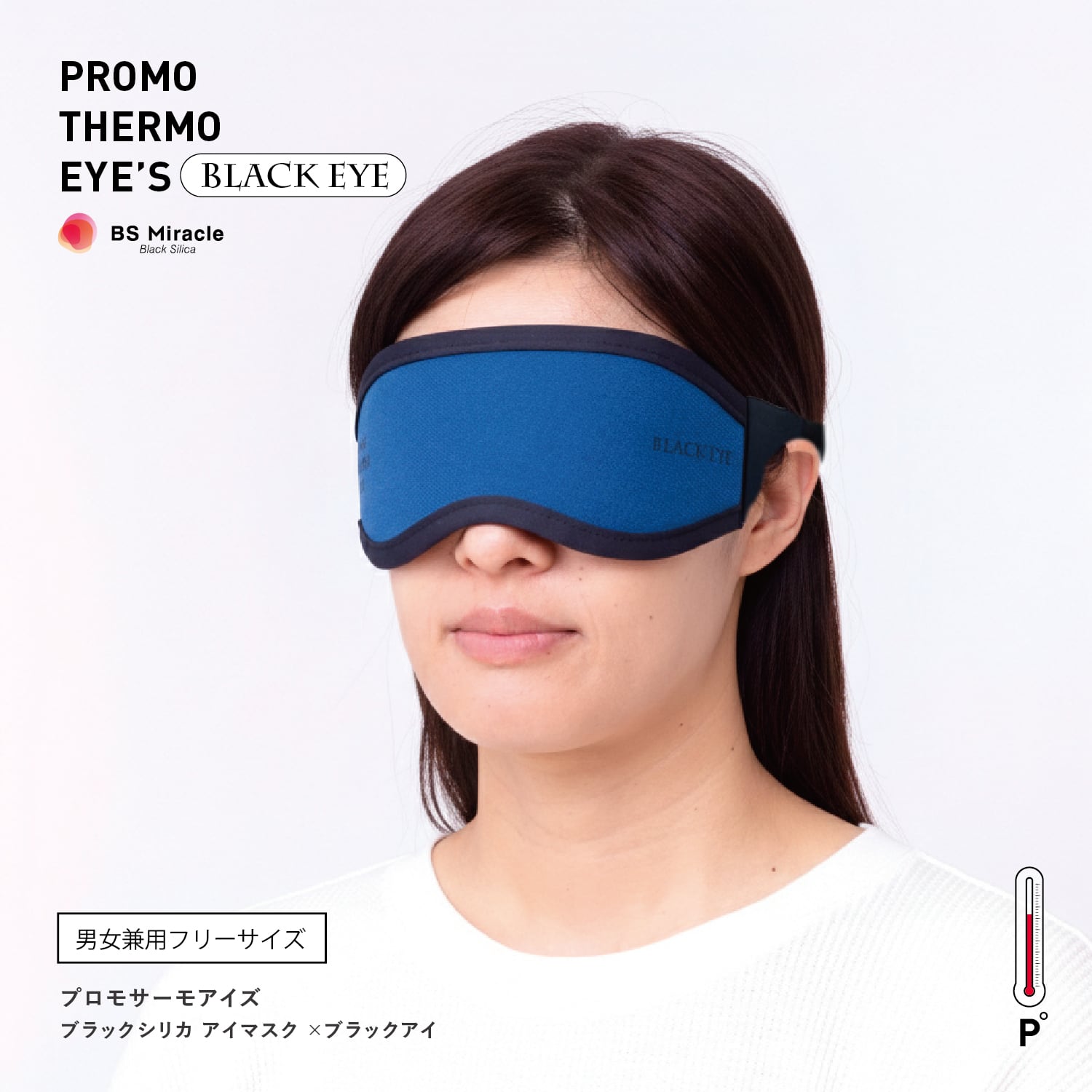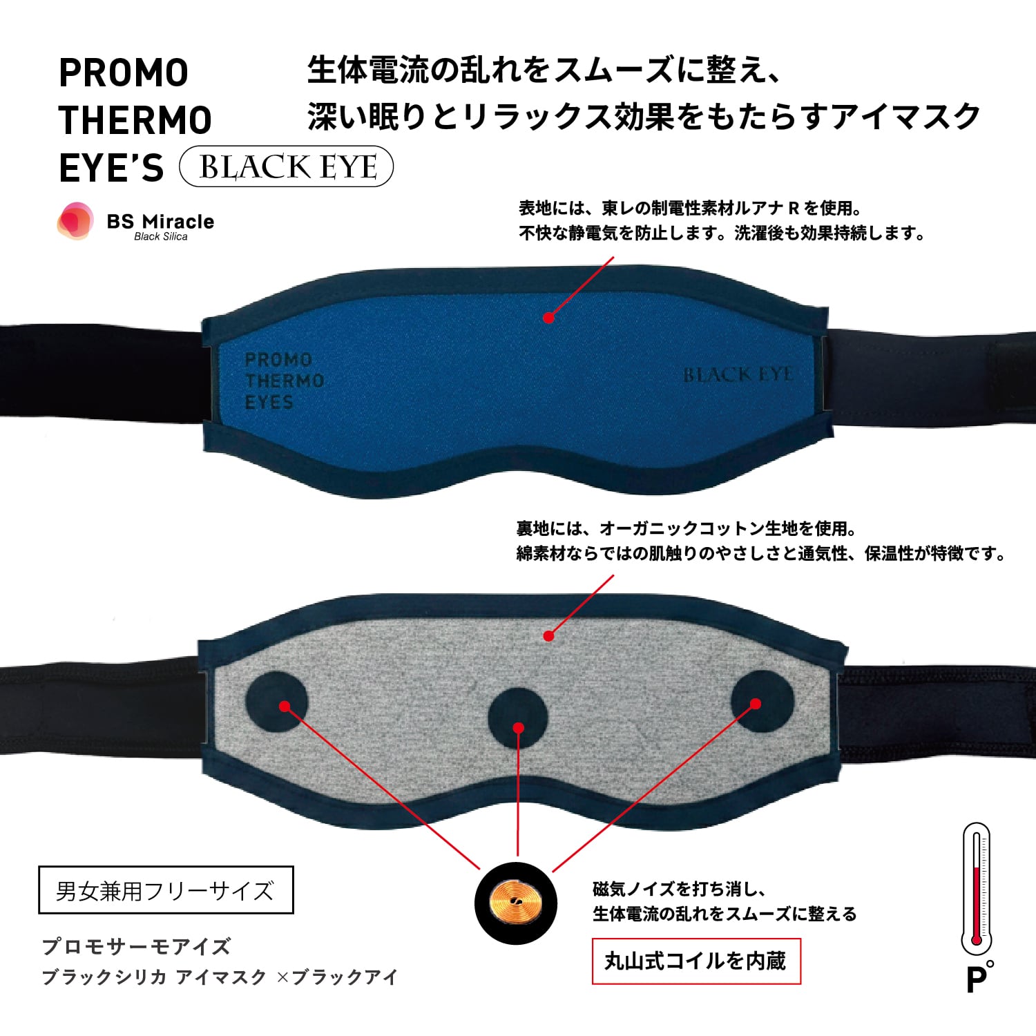 アイマスク本体部分には特殊蓄熱素材「BS Miracle Black Silica」を使用。