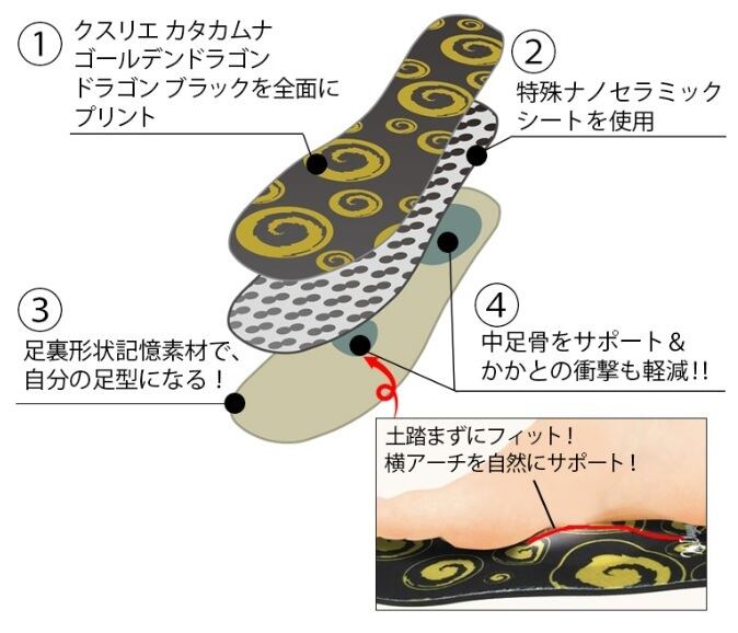 丸山先生開発のパワフルな特殊図形「クスリエ」と「電磁波吸収」作用のあるセラミックシートの作用で、疲れやすい足の負担を軽減し、元気アップをサポートするインソールです。